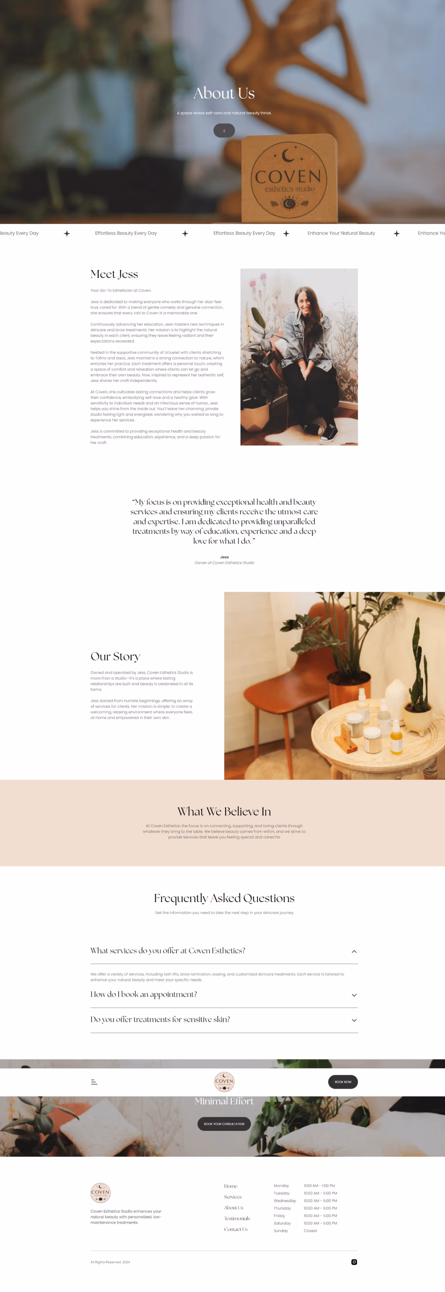 Soft, clean typography and a calming colour palette was used to capture Coven Esthetics’ welcoming and professional vibe, creating a soothing and polished visual identity. Interactive booking buttons, detailed service sections, and subtle hover animations enhance usability, offering a smooth and engaging experience that makes browsing and scheduling appointments effortless.